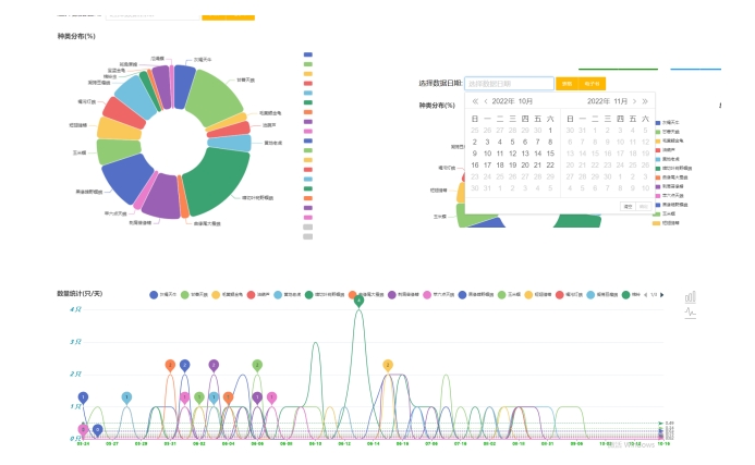 5、蟲(chóng)害統(tǒng)計(jì)功能。針對(duì)不同品種害蟲(chóng)識(shí)別結(jié)果歷史數(shù)據(jù),可選擇一定時(shí)間范圍內(nèi)數(shù)據(jù)查詢(xún)統(tǒng)計(jì),通過(guò)圖表形式顯示??蛇x任意害蟲(chóng)種類(lèi),直觀看出發(fā)生的蟲(chóng)害種類(lèi)和數(shù)量,從而判斷其危害程度。