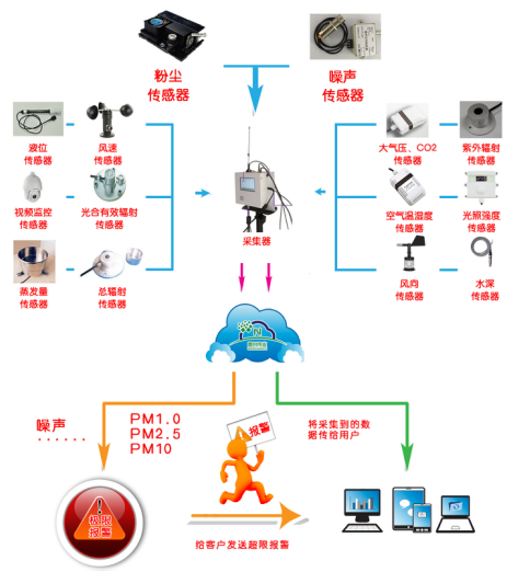 本系統(tǒng)主要由MC-CZ型環(huán)境揚(yáng)塵、噪聲監(jiān)測(cè)站、氣象站傳感器、戶外LED顯示屏、視頻采集系統(tǒng)、數(shù)據(jù)遠(yuǎn)程發(fā)送系統(tǒng)、后臺(tái)數(shù)據(jù)處理系統(tǒng)、監(jiān)測(cè)數(shù)據(jù)預(yù)警云平臺(tái)組成。數(shù)據(jù)平臺(tái)是一個(gè)互聯(lián)網(wǎng)架構(gòu)的網(wǎng)絡(luò)化平臺(tái),具有對(duì)各子站的監(jiān)控功能以及對(duì)數(shù)據(jù)的報(bào)警處理、記錄、查詢、統(tǒng)計(jì)、報(bào)表輸出等多種功能。