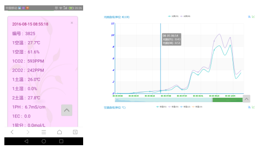 10、通過PC機和手機實時查看各個地點的空氣溫度、空氣濕度、二氧化碳、光照強度、土壤水分、地溫等農業(yè)環(huán)境參數(shù)監(jiān)測數(shù)據。(可不使用)