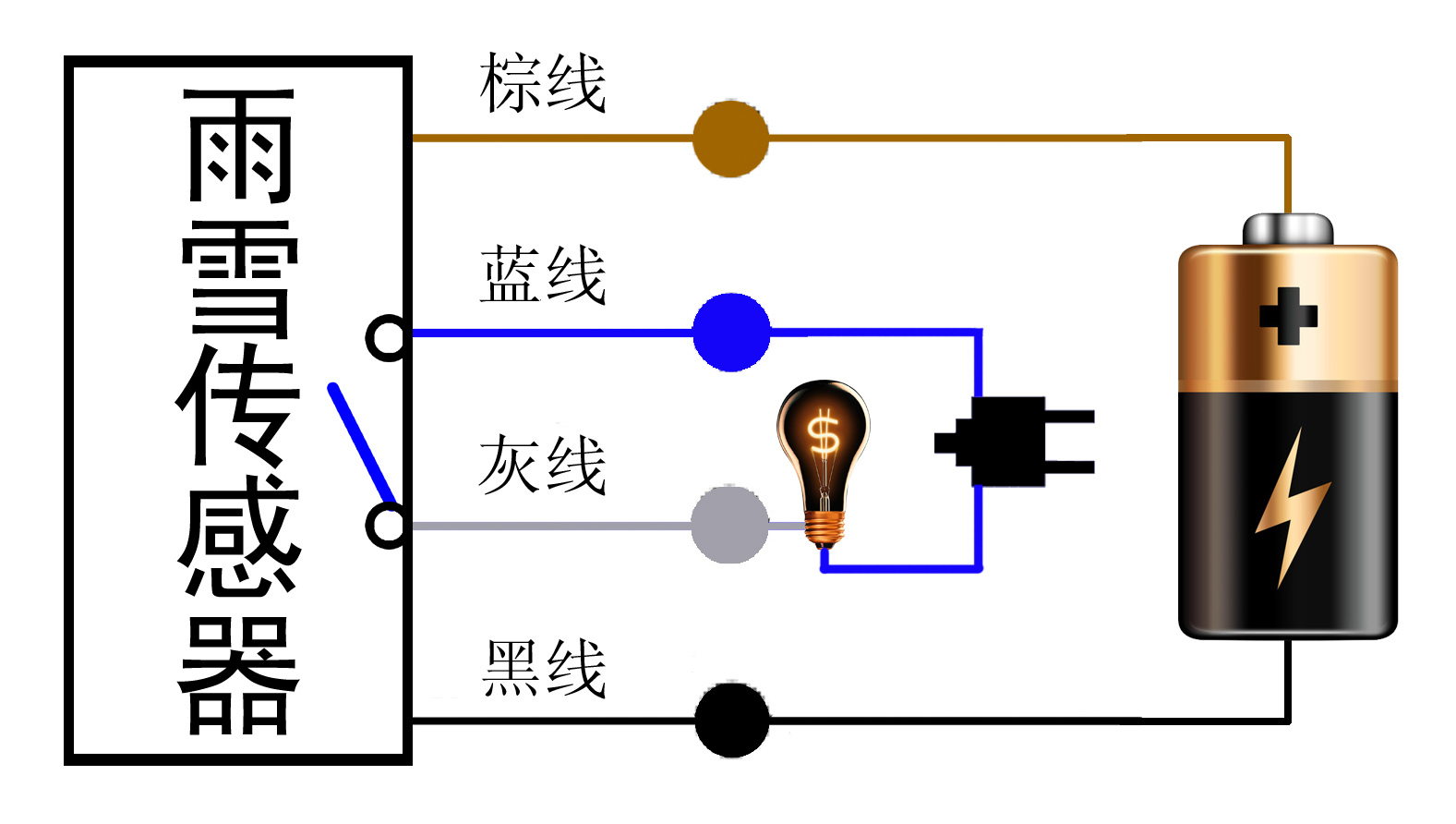 雨雪傳感器利用雨水的導(dǎo)電特性,采用檢測(cè)電路,表面柵形電極感應(yīng)外界雨雪情況,檢測(cè)是否有雨雪,內(nèi)部采用智能微處理器。內(nèi)置自動(dòng)加熱裝置可排除雨雪附著的干擾,保障系統(tǒng)的正常運(yùn)行。繼電器為一組常開、一組常閉。